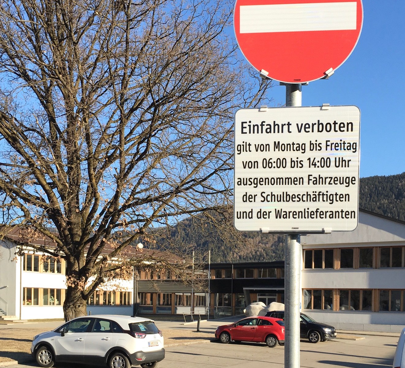 § 1: Das Befahren der beiden Parkplätze südlich und nördlich des Schulzentrums Friesach ist jeweils ab der Kreuzung mit der Karl-Schönherr-Straße von Montag bis Freitag von 06:00 Uhr bis 14:00 Uhr mit der Ausnahme für die Fahrzeuge der Schulbeschäftigten und der Warenlieferanten verboten (§ 52 lit. a) Z 2 StVO).