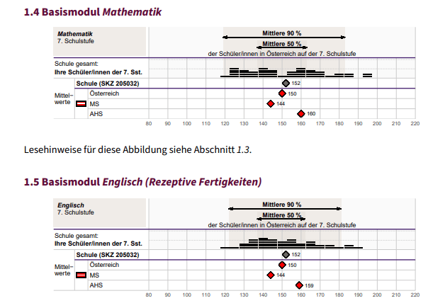 wie viel Prozent Ihrer Schüler/innen jeweils im Bereich der Referenzverteilung liegen. Der Schulmittelwert ergibt sich aus den Ergebnissen aller verpflichtend teilnehmenden Schüler/innen. Die Schüler/innen können in Deutsch (Lesen) und Mathematik zwischen 80 und 220 Kompetenzpunkte erreichen, in Englisch (Rezeptive Fertigkeiten) zwischen 80 und 190. Der österreichische Mittelwert der 7. Schulstufe liegt bei 150 Punkten. Diese Punkte lassen sich über Schulen hinweg vergleichen.