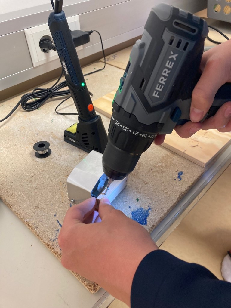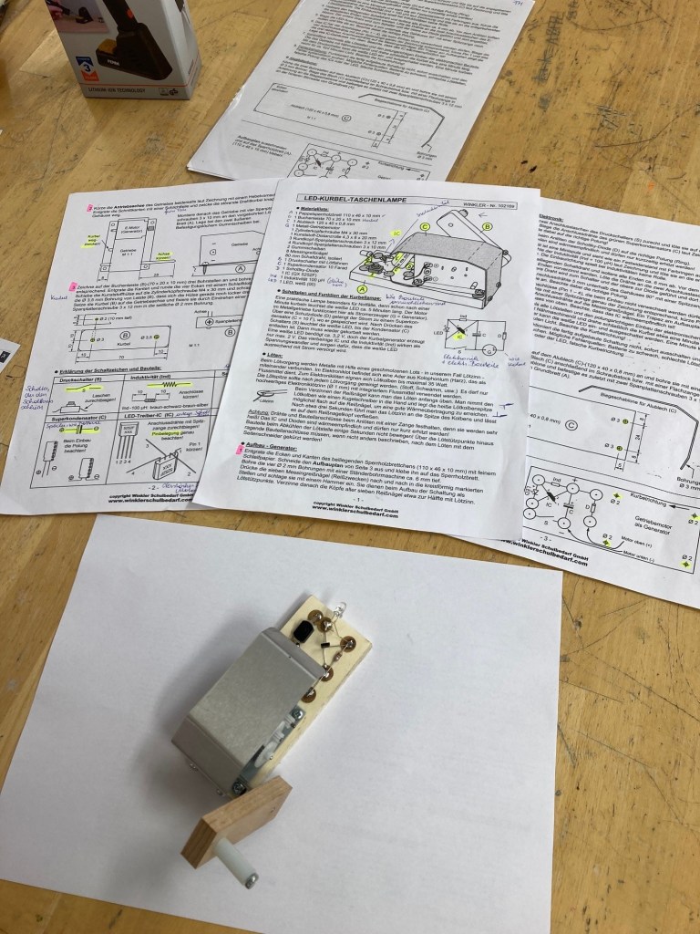Unter anderem wurde auch eine handbetriebene Notleuchte gebaut. Über eine Handkurbel wird ein Generator betrieben und der eingebaute Kondensator speichert die gewonnene elektrische Energie und gibt sie dann über Knopfdruck ab. Fähigkeiten/Wissen, handwerkliche Fertigkeiten (Zusammenbau, Löten etc.) und gemeinschaftliches Arbeiten lassen so praktische Gegenstände entstehen. Über die gelungenen Arbeiten freuen sich Schüler/innen der 4a/4b-Klassen mit den Pädagog/innen Martina Freissegger und Kevin Schorn.