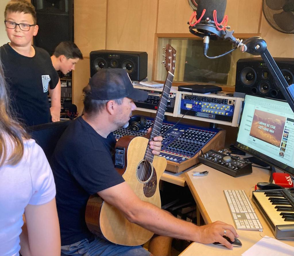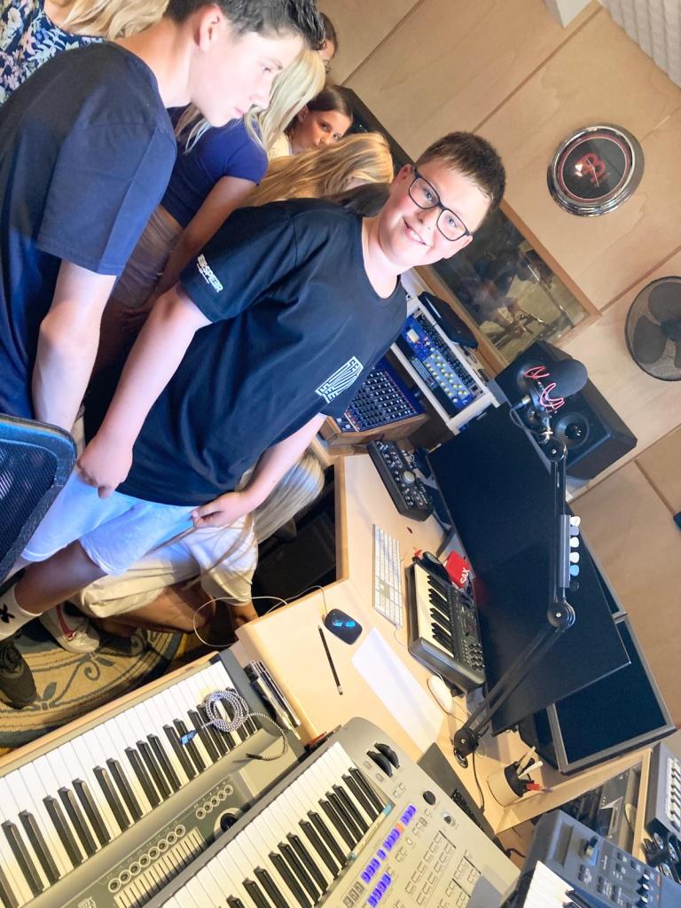 Fotos (c) MS Friesach, Southend music P. Prammerdorfer, 2025 – Ein musikalisches Erlebnis derSonderklasse für die Schülerinnen und Schüler des Schulchores (Ltg.: Christina LEITNER) bot sich Anfang Juli durch den Besuch des Tonstudios „Southend music“ in St. Veit/Glan.
