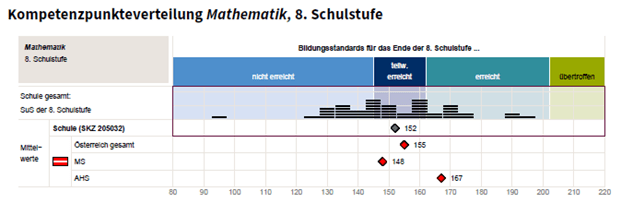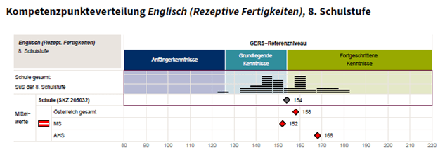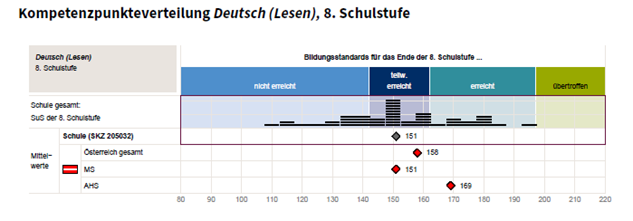 wie viel Prozent Ihrer Schüler/innen jeweils im Bereich der Referenzverteilung liegen. Der Schulmittelwert ergibt sich aus den Ergebnissen aller verpflichtend teilnehmenden Schüler/innen. Die Schüler/innen können in Deutsch (Lesen) und Mathematik zwischen 80 und 220 Kompetenzpunkte erreichen, in Englisch (Rezeptive Fertigkeiten) zwischen 80 und 190. Der österreichische Mittelwert der 7. Schulstufe liegt bei 150 Punkten, die Mittelwerte der 8. Schulstufe sind fachabhängig. Diese Punkte lassen sich über Schulen hinweg vergleichen.